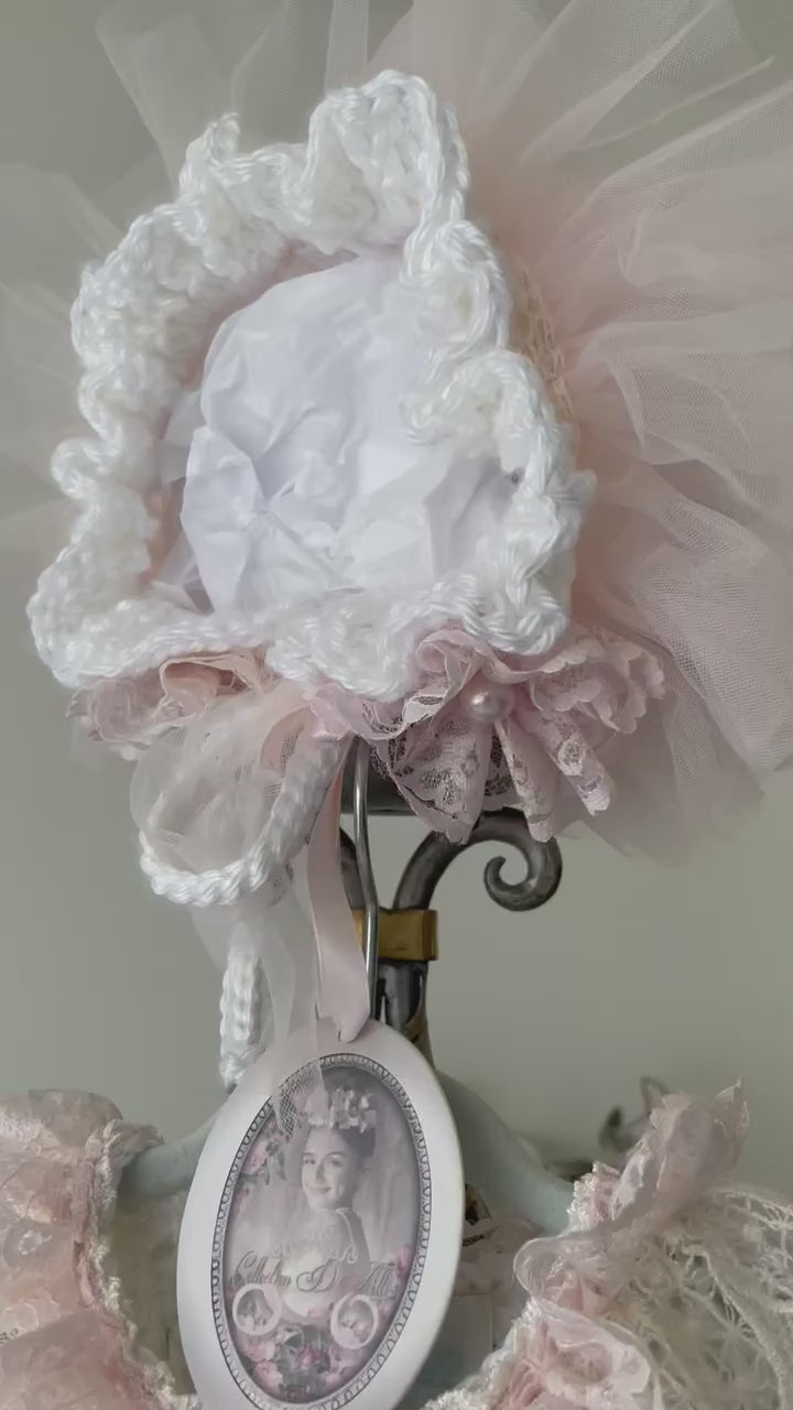 This exquisite ensemble features a hand-knit sweater adorned with lace trim, delicate tulle, floral accents, and pearl embroidery, paired with a matching lace bonnet that completes the storybook charm.
