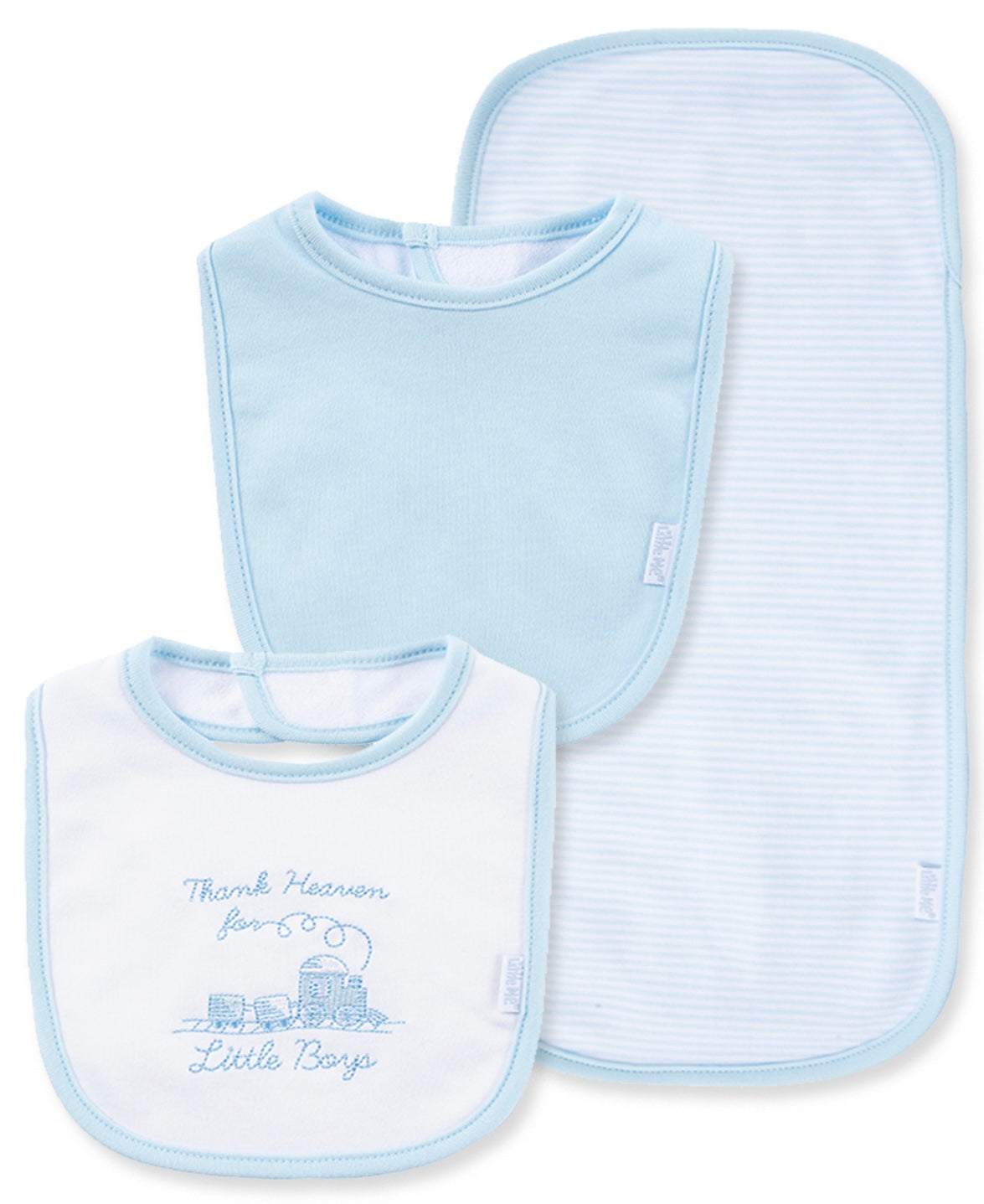 A darling duo for mealtime moments. This Heaven Sent bib and burp cloth set features an embroidered train design with soft blue and white tones — the perfect blend of sweetness and practicality for your little boy. Crafted from gentle, absorbent cotton, it keeps baby clean and comfortable while adding a timeless touch to your newborn essentials.